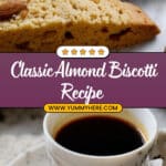 Classic Italian Almond Biscotti are twice-baked cookies that are crisp, crunchy, and perfect for dipping into coffee or tea. Made with toasted whole almonds and a simple combination of flour, sugar, eggs, and a hint of vanilla, these biscotti dry out in the oven for a satisfying crunch that improves with age.