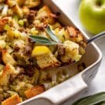 I love that this Apple & Sausage Stuffing Recipe is flexible, so feel free to make it your own! Sometimes I switch the sausage for a spicy chorizo if I’m feeling bold, or swap the apples for pears when apples aren’t in season. You can also easily make it vegetarian by using plant-based sausage and veggie broth.