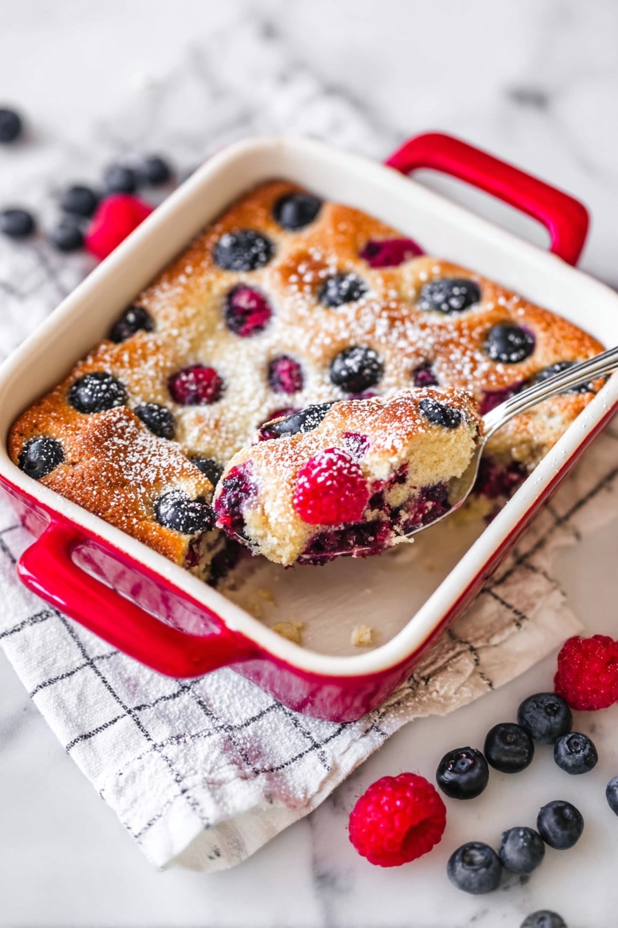 Pour the batter into your prepared dish. Then scatter the fresh blueberries and raspberries evenly over the top. I like to gently press some berries into the batter to keep them from sliding off when you serve—this also helps them break down slightly while baking for extra juiciness.