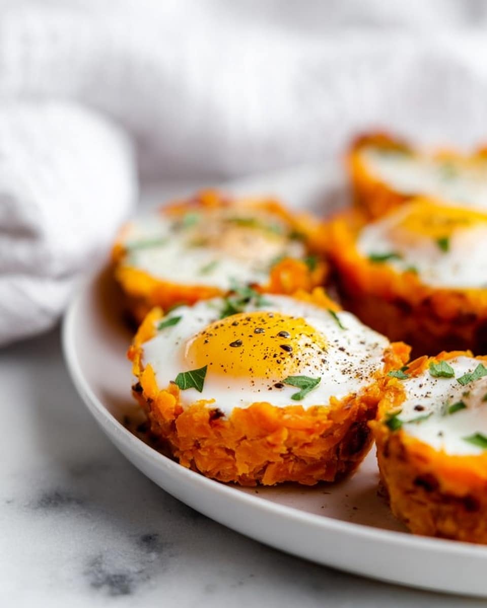 - Add Eggs and Bake: Remove the muffin tin from the oven. Gently press the bottoms of each sweet potato cup to compact them, then carefully crack an egg into each cup.