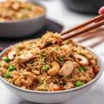 This Best Recipe for Chicken Fried Rice is a flavorful homemade version of the classic takeout dish featuring tender chicken, fresh ginger, crunchy cashews, and a spicy kick of sriracha. Perfect for a quick and satisfying weeknight meal, this easy recipe combines savory soy and oyster sauces with vibrant vegetables and fluffy rice for a deliciously balanced dish.