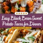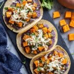 These Vegetarian Black Bean Sweet Potato Tacos are a delicious and healthy meal option, perfect for lunch or dinner. Sweet potato cubes are sautéed with onions and garlic until tender, then paired with creamy refried black beans, all wrapped in warm corn tortillas and topped with Monterey Jack cheese and fresh cilantro for a flavorful, satisfying taco experience.