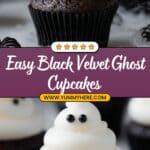 Black Velvet Ghost Cupcakes are a spooky and delicious Halloween treat featuring a tender, rich black velvet cupcake base made with black cocoa powder and buttermilk, topped with smooth cream cheese frosting decorated with candy eyes for a fun ghostly effect.