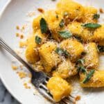 This homemade Butternut Squash Gnocchi recipe features tender, pillowy gnocchi made from roasted butternut squash blended with flour and egg, served with a rich sage brown butter sauce and finished with grated amaretti cookies and Parmigiano Reggiano cheese for a delightful blend of savory and sweet flavors.