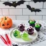Celebrate Halloween with these fun and easy Halloween Jello Shots, perfect for parties. This recipe combines your favorite jello flavor with vodka and festive gummy eyeballs and green boba pearls for a spooky twist.