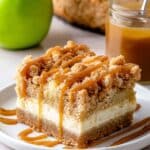 - These bars combine four distinct layers: a buttery crust, creamy cheesecake filling, spiced apple topping, and a crunchy crumble, all highlighted by a rich caramel sauce drizzle.