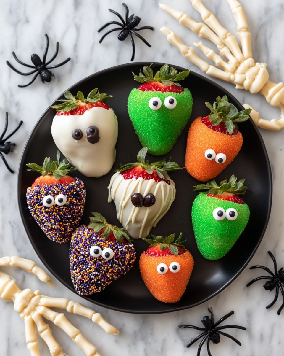 - Decorate Strawberries: Place dipped strawberries on a parchment-lined baking sheet. Decorate immediately with candy eyeballs, chocolate chips, and a variety of sprinkles, depending on the Halloween theme desired. Repeat this process for all strawberries.