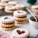 Classic Linzer Cookies featuring a buttery tender almond-flavored dough with a sweet raspberry jam filling and delicate powdered sugar dusting. These beautifully scalloped sandwich cookies are perfect for holiday gatherings and special occasions, offering a delightful balance of soft cookie texture and fruity sweetness.