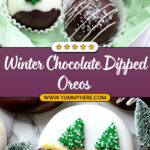 Create festive Winter Wonderland Chocolate Dipped Oreos by coating chocolate sandwich cookies in rich melted dark or milk chocolate, then decorating with white chocolate snow accents and evergreen tree sprinkles for a magical winter treat.