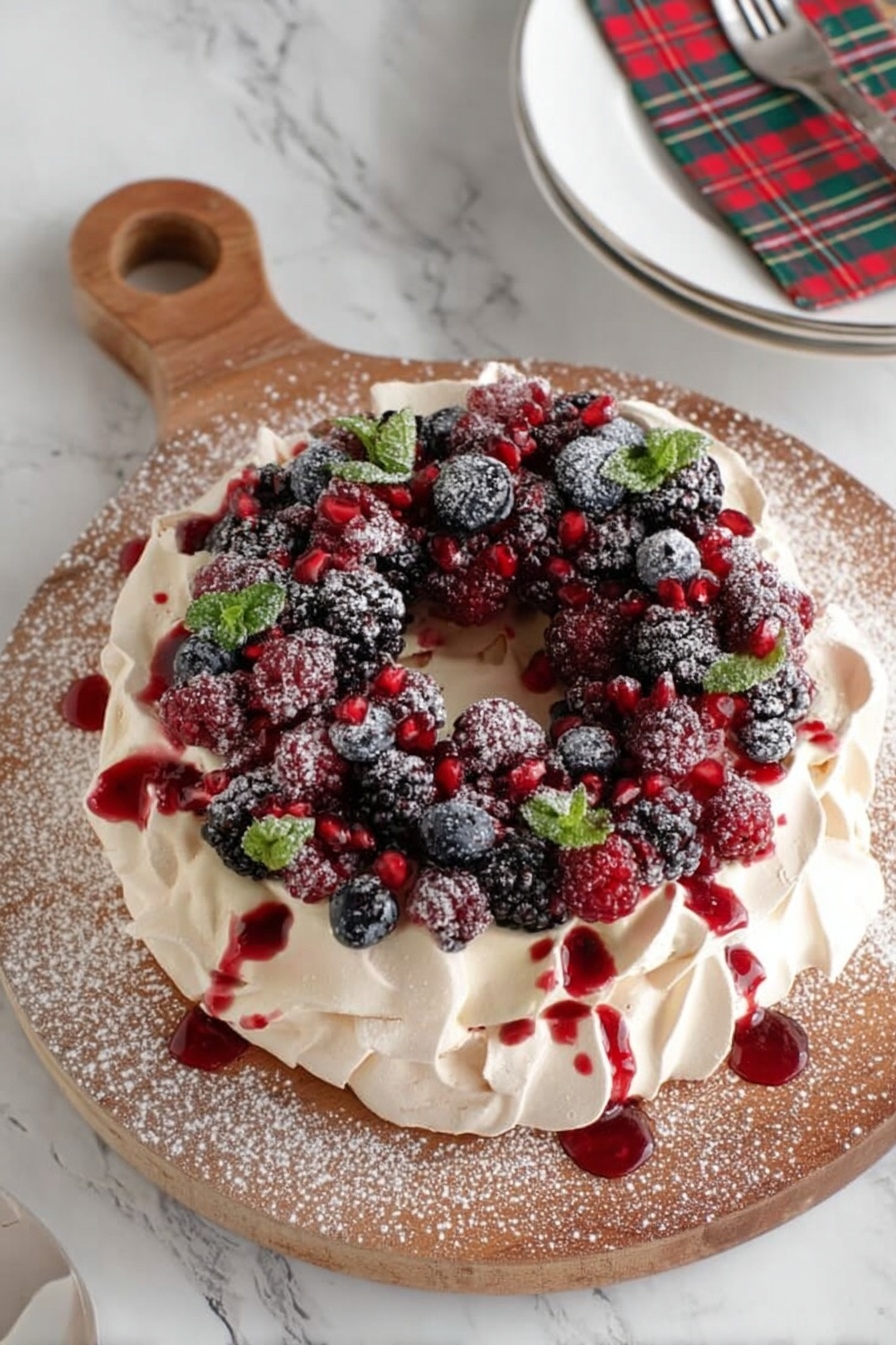 - This Christmas Pavlova Wreath is perfect for the festive season, showcasing your favorite berries combined with raspberry coulis, fresh mint, and decadent whipped cream.