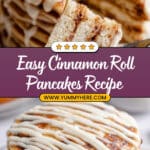 Fluffy cinnamon roll pancakes combining the sweet, warm flavors of cinnamon rolls with the light texture of pancakes, topped with a creamy cinnamon frosting. Perfect for a special breakfast or brunch treat.