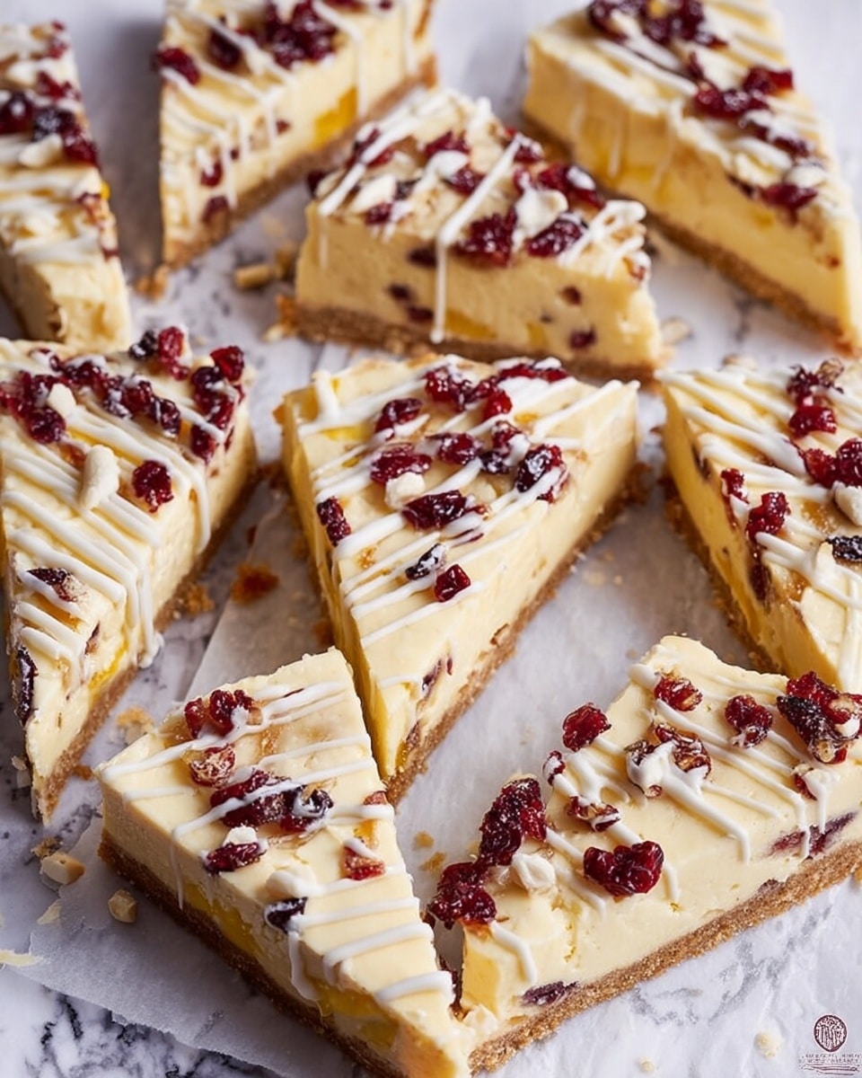 - Frost and decorate: Once the blondies have cooled completely, use an offset spatula to spread the cream cheese frosting evenly over the top. Sprinkle with the additional dried cranberries and drizzle the melted white chocolate over the surface using a spoon or piping method.