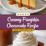 This luscious Pumpkin Cheesecake combines creamy, rich cheesecake with the warm, spiced flavors of pumpkin and pumpkin pie spices. Featuring a buttery graham cracker crust and a smooth, dense filling, it’s perfect for holiday celebrations or any time you crave a seasonal dessert. Topped with butterscotch or caramel sauce and rum-infused whipped cream, this cheesecake is both impressive and comforting, delivering a perfect balance of sweetness and spice without cracks or fuss.