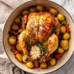 This Whole Dutch Oven Roast Chicken recipe delivers a perfectly juicy and flavorful roast chicken with crispy skin, achieved by seasoning a whole chicken with a spice rub and roasting it over vegetables and potatoes in a preheated Dutch oven. It’s ideal for a cozy family dinner or entertaining guests.