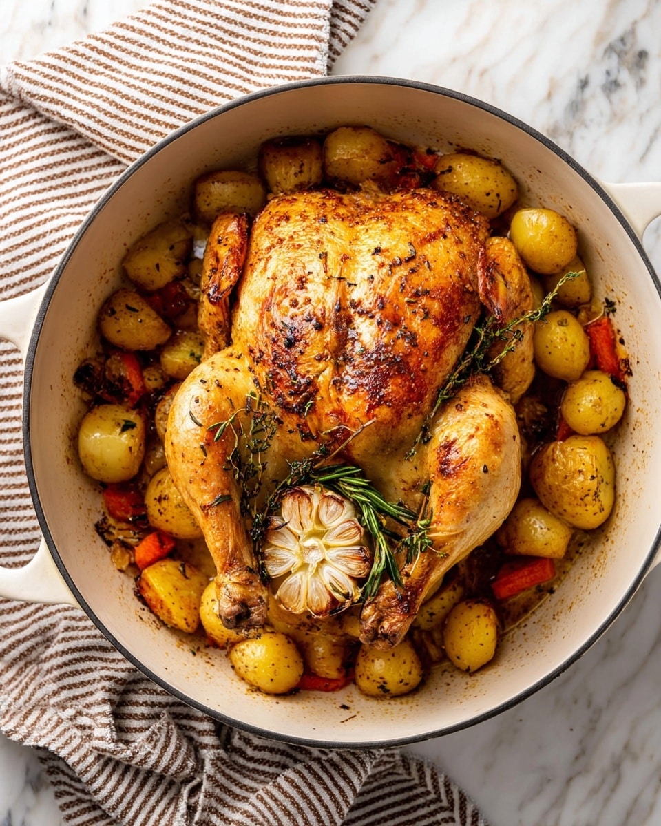 This Dutch Oven Roast Chicken has become my go-to for cozy dinners and special occasions alike. I love how simple yet impressive it feels, and the joy on my family’s faces when I serve it is priceless. You really can’t go wrong with this recipe if you want a juicy, flavorful bird alongside perfectly roasted veggies without a ton of fuss. Give this a try—you might just find your new favorite roast chicken recipe!