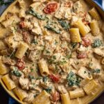 Tuscan Chicken Pasta is a creamy and flavorful Italian-inspired dish featuring tender seared chicken breasts served over rigatoni pasta tossed in a rich cream sauce with sun-dried tomatoes, fresh spinach, cherry tomatoes, and parmesan cheese. This comforting recipe combines savory herbs and spices with fresh ingredients for a satisfying meal perfect for any night of the week.