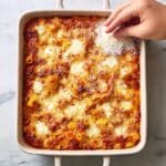 Pour your sauce and sausage mixture over the al dente pasta in the pot and gently stir to coat everything evenly. Spoon half the mixture into your prepared 9×13 baking dish. Sprinkle on half of the shredded mozzarella and half of the remaining pecorino (1½ tablespoons). Repeat with the remaining pasta and cheeses so the top layer is nice and cheesy.