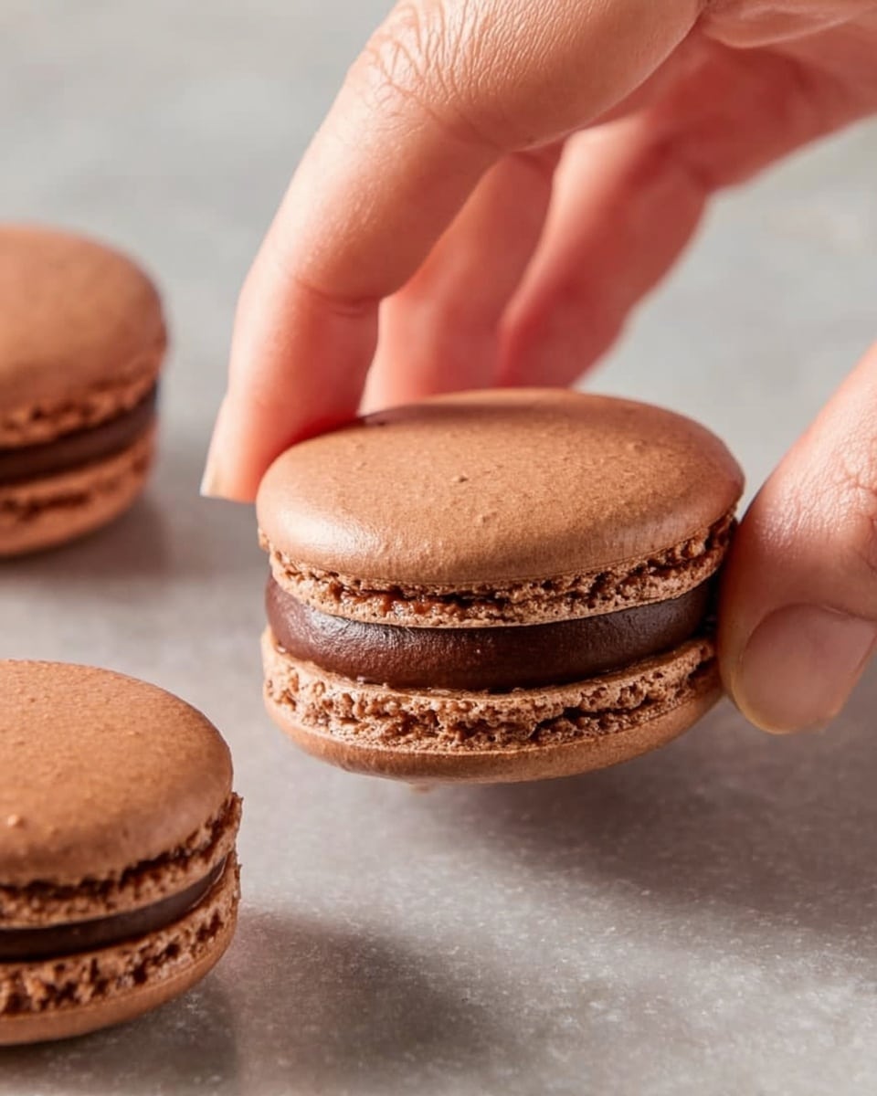 I typically dust the finished macarons with a tiny sprinkle of cocoa powder or edible gold dust for a touch of elegance. You can also try fine sea salt flakes on top of the filling for a trendy sweet-salty twist — my friends always ask for that version!