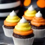Use a piping bag and carefully spoon the colored frostings side-by-side inside it, layering orange, white, and yellow. When you pipe, the colors come out as a beautiful swirl that mimics candy corn stripes. It’s easier than it sounds and looks super impressive!