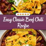 This Classic Beef Chili Recipe is a hearty, flavorful, and comforting dish made with ground beef, beans, and a robust blend of spices. Perfect for weeknight dinners, it combines tender beef, rich tomato sauce, and savory seasonings simmered to perfection. Customize with your favorite toppings for a delicious, crowd-pleasing meal.
