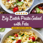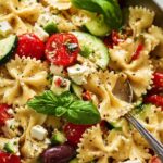 Nagi’s Big, Easy Pasta Salad is a vibrant and flavorful dish featuring bow tie pasta tossed with fresh cucumbers, cherry tomatoes, Kalamata olives, and Greek feta. The salad is dressed with a zesty mix of apple cider vinegar, olive oil, garlic, Dijon mustard, and honey, enhanced by Italian herbs. Perfect for quick meal prep or serving guests, this pasta salad is best enjoyed when the hot pasta is tossed in the dressing to absorb maximum flavor.