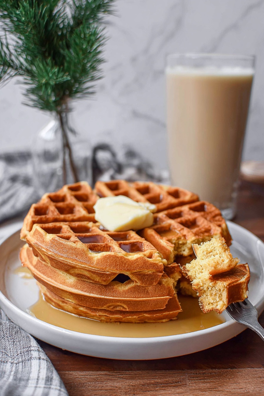 Eggnog waffles freeze really well! Lay them out on a baking sheet in a single layer and freeze until solid. Then transfer to a freezer bag and keep up to 2 months. This is a lifesaver for busy holiday mornings when you don’t want to start from scratch.