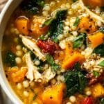 This Fall Chicken Stew with Quinoa and Butternut Squash is a hearty and comforting dish perfect for chilly autumn or winter nights. Featuring roasted butternut squash, tender rotisserie chicken, nutrient-packed quinoa, flavorful herbs, and a medley of spices, this stew combines warmth and wholesomeness in every bowl. The addition of fresh kale and parsley adds a vibrant touch and boosts the nutritional profile, making it a satisfying and nourishing meal.