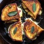 Place 1 or 2 sandwiches at a time into a clean skillet over medium heat. Cook 3-5 minutes per side until the bread is toasted to a beautiful golden brown and the cheese is melted gooey goodness. In the last minute of cooking, add half a tablespoon of butter and a couple of sage leaves to the skillet for a fragrant, buttery finish. Repeat this with the rest of your sandwiches. When you serve them up, the crispy sage adds the perfect crunchy, herbal touch that my family always asks for seconds on.