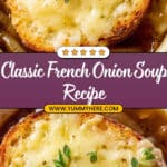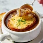 Classic French Onion Soup made with deeply caramelized onions, rich beef stock, and topped with toasty bread slices smothered in melted Gruyere and Parmesan cheese. This hearty, comforting soup combines traditional ingredients and techniques to replicate the restaurant-quality experience in your own kitchen.