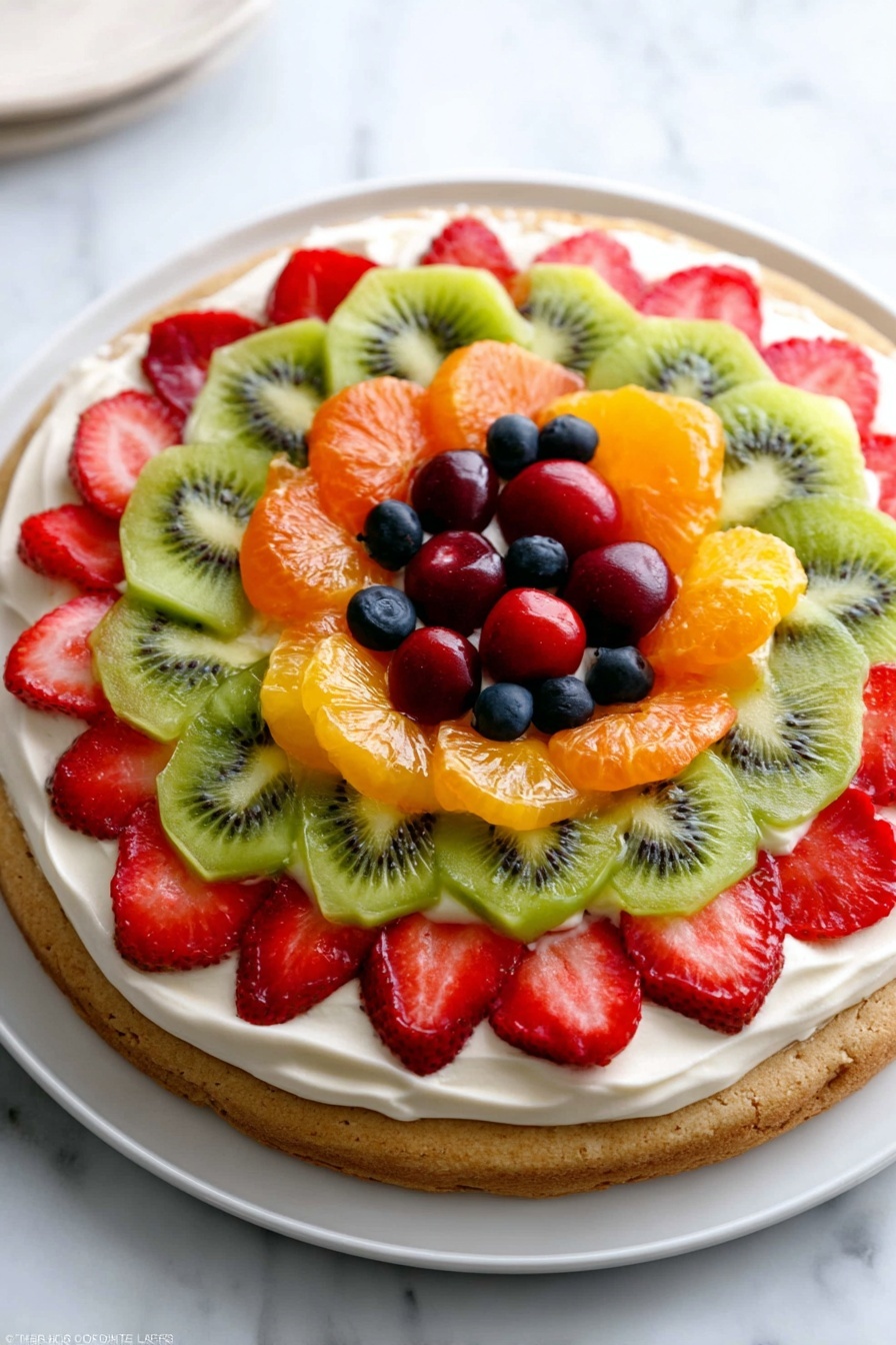 This colorful fruit pizza features a soft, chewy sugar cookie crust topped with a thick, tangy cream cheese frosting and a vibrant assortment of fresh fruit. Perfect as a refreshing and visually stunning summertime dessert, it’s customizable with your favorite fruits and ideal for sharing with family and friends.