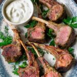 After roasting, tent the lamb with foil and let it rest for about 10 minutes. This is the step I learned that can’t be skipped — resting allows the juices to redistribute so your lamb stays moist and tender instead of drying out when sliced. Cut the chops between the bones and arrange on a platter. Grab some tzatziki if you want a cool, creamy contrast that my family goes crazy for.
