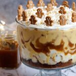 - Repeat Layers: Repeat the layering process using the remaining ginger cake slices, gingerbread men biscuits, custard, whipped cream, and caramel, building up the trifle with the same order and quantities.