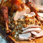 A traditional and indulgent Thanksgiving Turducken featuring a deboned turkey stuffed with layers of duck and chicken, accompanied by a flavorful cornbread and sausage stuffing infused with fresh herbs and cranberries. This impressive dish combines multiple poultry flavors for a festive centerpiece.