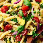This vibrant Pasta Primavera features tender penne pasta tossed with a medley of fresh spring vegetables, aromatic herbs, and a tangy lemon-pecorino dressing. Lightly sautéed zucchini, yellow squash, asparagus, cherry tomatoes, and red onion combine for a colorful and flavorful dish perfect for a fresh, seasonal dinner.