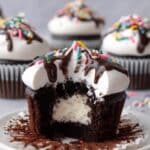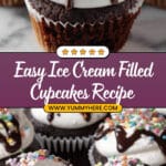 Delight in these fun and festive Ice Cream Filled Cupcakes, combining rich chocolate cake with a surprise scoop of creamy ice cream in the center. Topped with fluffy whipped topping, melted chocolate drizzle, and colorful sprinkles, these cupcakes are perfect for parties, warm weather treats, or any celebration.