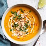- Serve and Garnish: Divide the soup among bowls. Garnish with roasted almond slices or peanuts, chopped cilantro, a drizzle of coconut milk if desired, and a sprinkle of red chili flakes for a bit of heat.