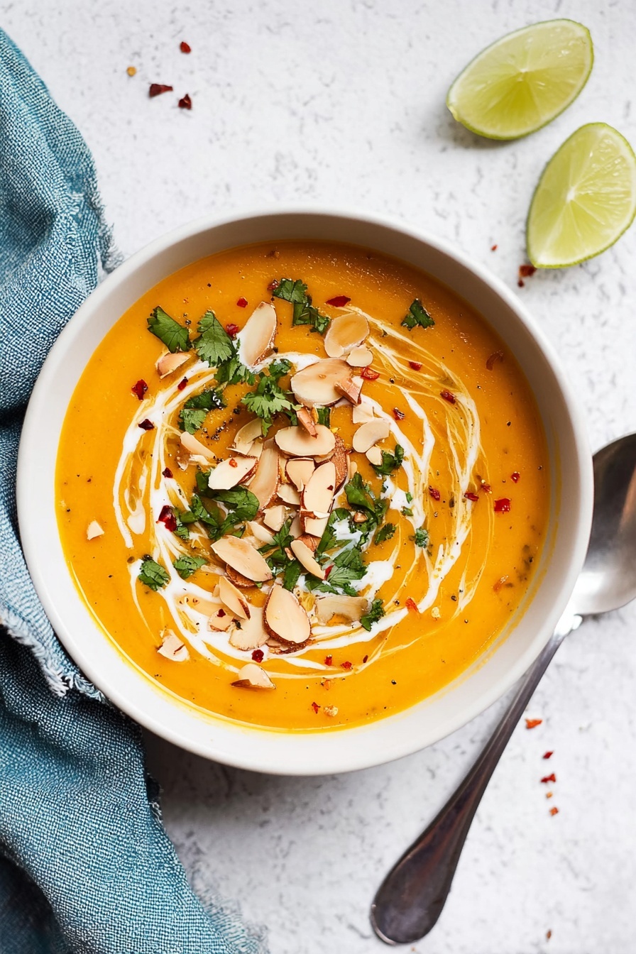 Ladle the soup into bowls and sprinkle with roasted almond slices or peanuts, chili flakes, and chopped fresh cilantro. A swirl of coconut milk on top adds a lovely touch and extra creaminess. Serve it up and watch everyone go crazy for this comforting delight!