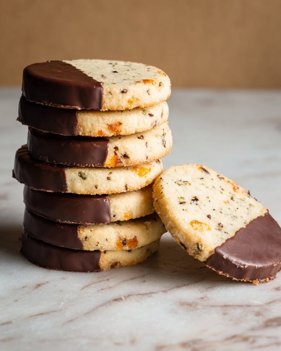 - Dip in chocolate glaze: Line two cookie sheets with parchment paper. Whisk the neutral oil into the warm melted bittersweet chocolate until glossy and smooth. Pour the chocolate into a shallow glass or ramekin suitable for dipping. Dip each cooled cookie halfway into the chocolate, then place it on the parchment-lined sheets. Allow the chocolate to set at room temperature or refrigerate briefly.