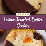 Jeweled Butter Cookies are buttery, tender cookies studded with vibrant pistachios, dried apricots, and sour cherries, finished with a glossy bittersweet chocolate glaze. These festive cookies boast a tender crumb with bursts of fruity and nutty flavors, perfect for holiday gatherings or special occasions.