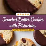 Jeweled Butter Cookies are a delightful treat featuring rich, buttery dough studded with vibrant pistachios, dried apricots, and sour cherries. Finished with a glossy bittersweet chocolate glaze, these cookies combine fruity tartness and nutty crunch with smooth chocolate, perfect for festive occasions or everyday indulgence.