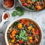 A hearty and nutritious lamb, lentil, and squash stew packed with warming spices and vibrant vegetables. This stew combines tender lamb mince, green lentils soaked overnight for optimal texture, and seasonal vegetables like butternut squash, cavolo nero, and cherry tomatoes, simmered slowly in a flavorful spiced vegetable stock. Aromatic herbs and a touch of lemon juice brighten the dish, making it perfect for a comforting family meal. A flexible recipe that can be made vegetarian by omitting the lamb.