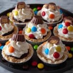 These delightful Leftover Candy Halloween Tarts are a perfect way to repurpose your leftover Halloween candy into a festive and delicious dessert. Featuring a crisp tart shell filled with creamy instant chocolate almond pudding and topped with sweet whipped cream and chopped candy pieces, these tarts are simple, quick, and crowd-pleasing.