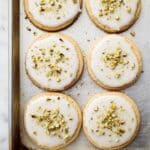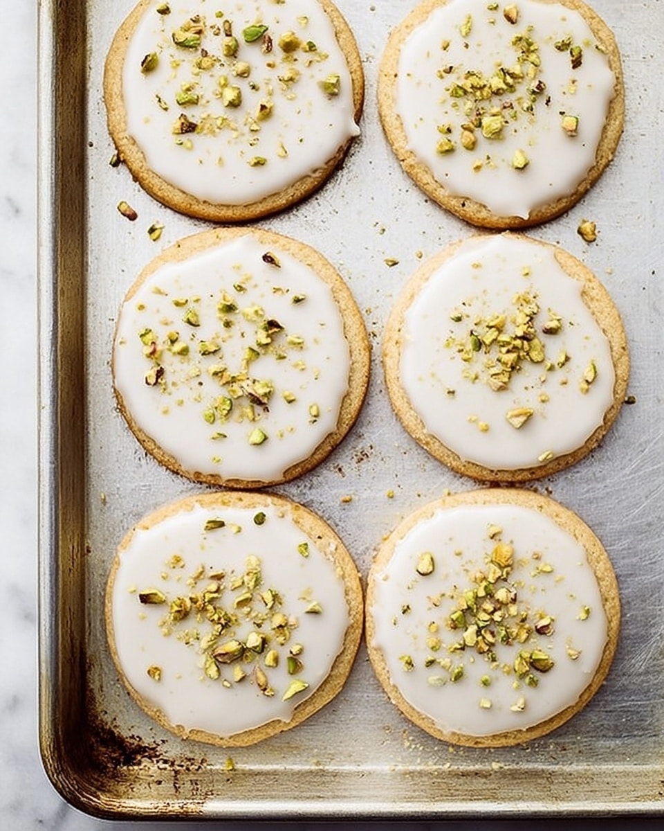- Glaze and Garnish: Once the cookies are fully cooled, spread a thin layer of lemon glaze on top of each cookie using an offset spatula or kitchen knife. Immediately sprinkle with the chopped pistachios. Let the glaze set for a few minutes before serving.