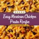 Mexican Chicken Pasta combines tender chicken bites, colorful vegetables, and bow tie pasta in a zesty salsa and taco seasoning sauce. Topped with creamy sour cream and melted Colby-Jack cheese, this one-pan skillet meal is perfect for quick, flavorful dinners or satisfying leftovers.