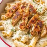 Freezing this dish is a little tricky because of the creamy sauce—it can separate when thawed. If you want to freeze it, I recommend freezing the pasta and chicken separately, then reheating on the stove with a splash of milk or cream to bring back the texture.