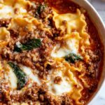 One Pot Lasagna Soup offers all the rich, comforting flavors of traditional lasagna in a warm, hearty soup. This easy-to-make recipe combines ground beef, Italian sausage, tomato sauce, and lasagna noodles simmered together with aromatic herbs and spices, topped with a creamy blend of ricotta and mozzarella cheeses for a satisfying family-friendly meal.