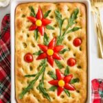Poinsettia Focaccia Bread is a festive and visually stunning savory bread, perfect for holiday gatherings. Featuring a soft and airy dough topped with red bell peppers arranged into poinsettia flower shapes, yellow cherry tomatoes as flower centers, and optional arugula for leaf decoration, this focaccia is both delightful to look at and delicious to taste.