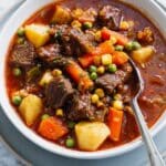 - Add Frozen Vegetables and Season: Stir in the frozen corn and peas. Adjust seasoning with additional salt and freshly ground black pepper to taste. Serve hot and enjoy a comforting beef stew.