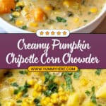 A hearty and flavorful Pumpkin and Chipotle Corn Chowder that combines the sweetness of pumpkin and corn with the smoky heat of chipotle peppers for a comforting and slightly spicy soup perfect for any season.
