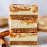 I usually eat these bars cold or at room temperature, but if you want a warm dessert, pop a piece in the microwave for about 15 seconds. Be careful not to overheat, or the cheesecake might become grainy. Pairing warm bars with cold whipped cream or ice cream is simply divine.